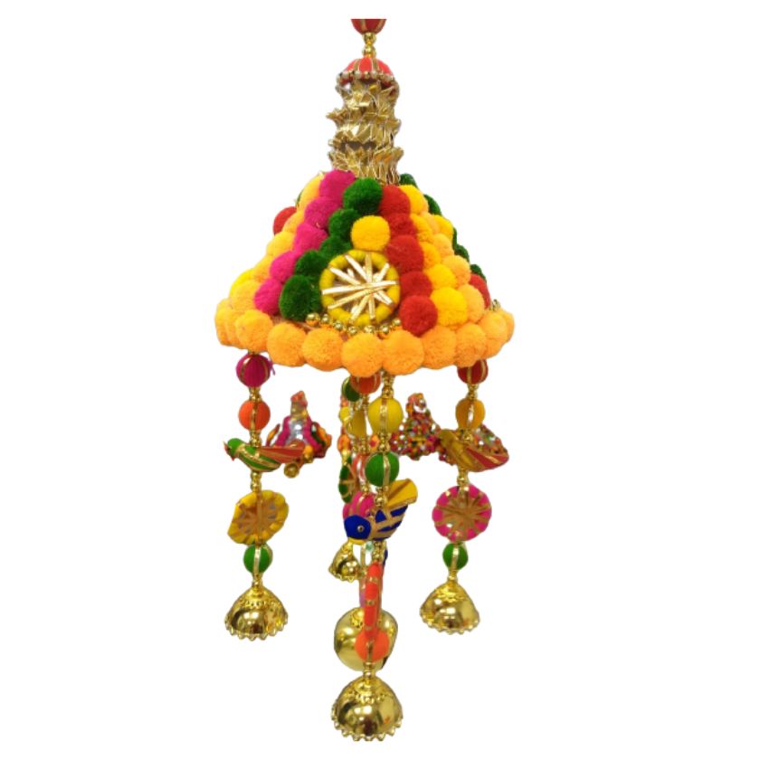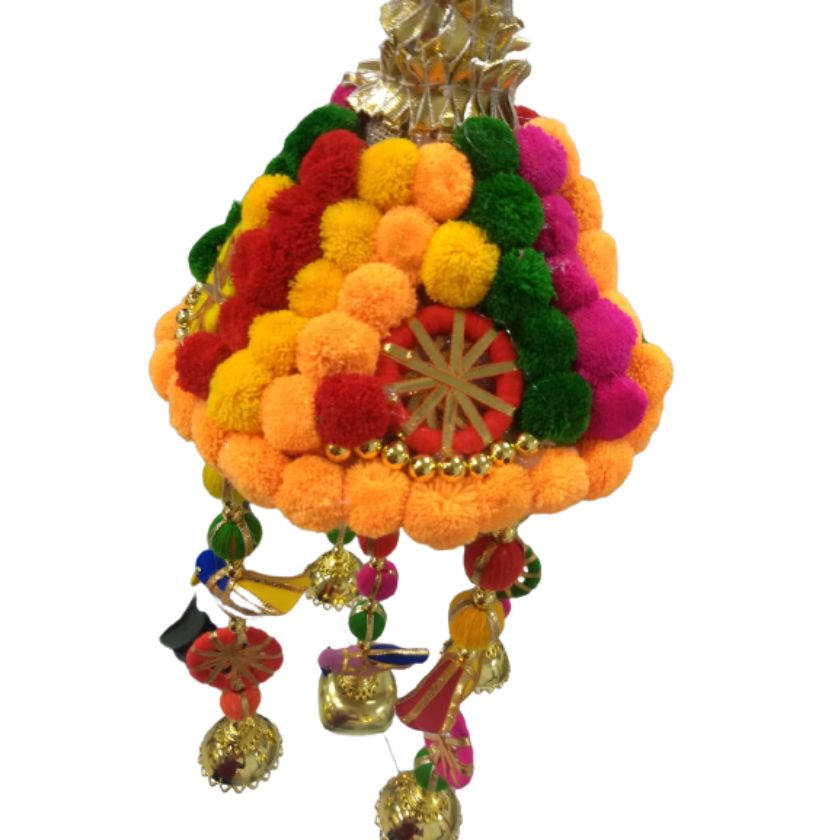 Round Centre Hanging Wall Roof Ceiling Hanging Jhoomar With Parrot and Round Pomp Pomp – Decorative Ornament – Party Decorations – Indian Traditional – Home Décor for Wedding Festivities & Gifting