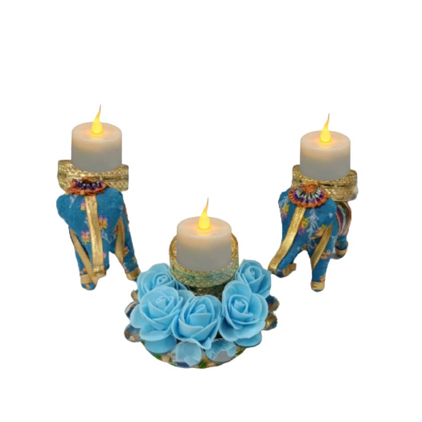 Handcrafted Elephant Tea Light Holder Set of 3, Flower Fairy Tealight Candle Stand T-Light Holder for Christmas & Festival Décor, Gifts, Decorative Lighting Accessories ( 2 Elephant sets with 1 centerpiece-Blue color ).