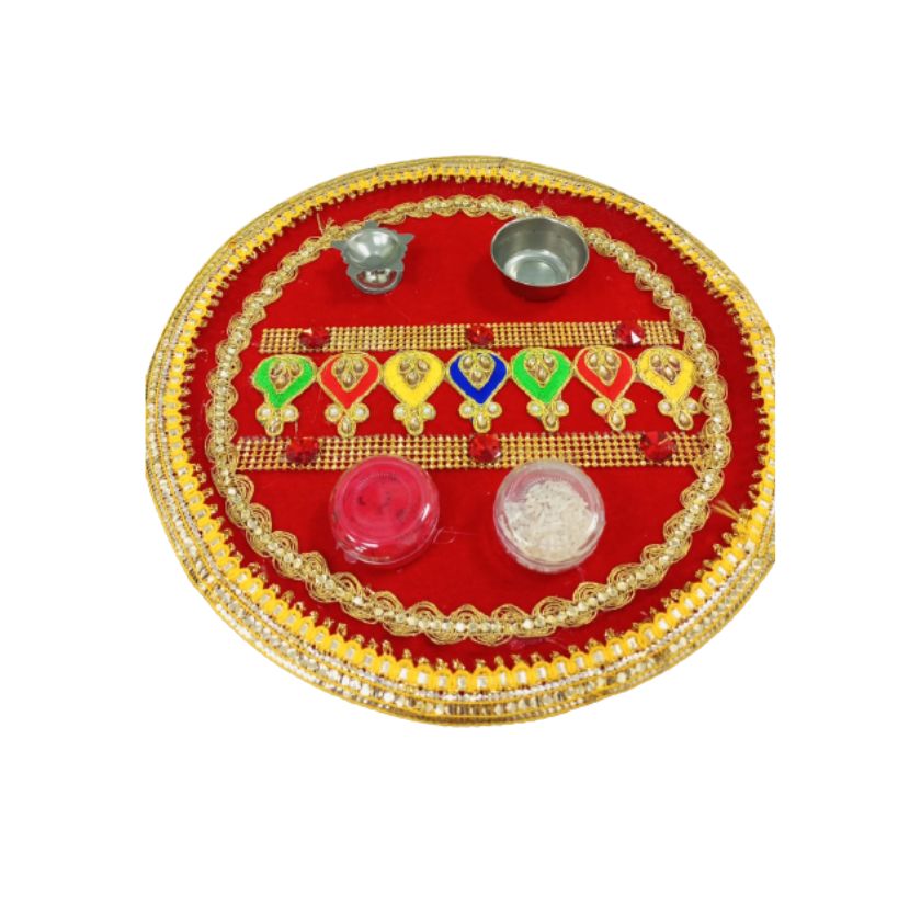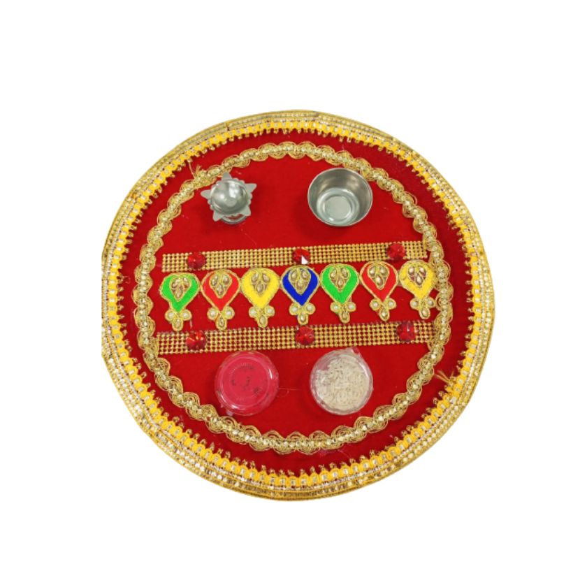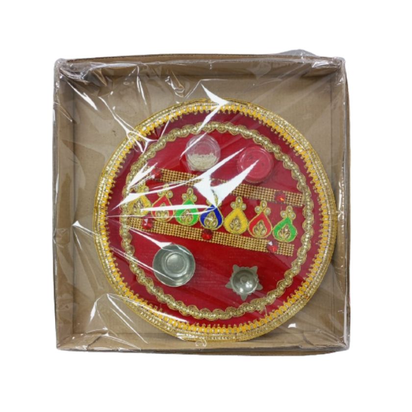 Pooja Thali with 2 Kumkum Chawel Bowl Holder Red and Gold